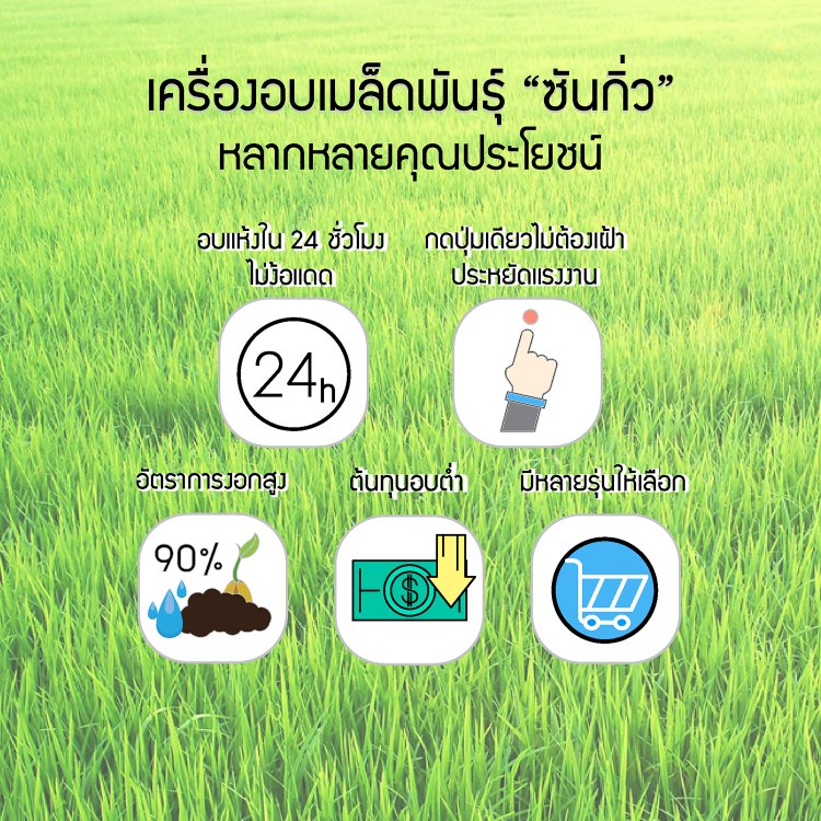 วันนี้ เครื่องอบเมล็ดพันธุ์ “ซันกิ่ว” จะทำให้ชีวิตง่ายขึ้น ฝนตกแดดออกก็อบได้อย่างต่อเนื่อง กดปุ่มเดียวจนจบการทำงาน ไม่ต้องนั่งเฝ้า ที่สำคัญคือ ประหยัดค่าลงทุนลานตาก แรงงาน และเชื้อเพลิง พร้อมการันตีอัตราการงอกสูงเกิน 90%